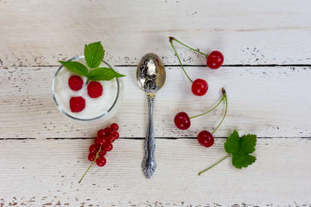 yogurt, metal spoon and berries of cherry and red currant on a white table
