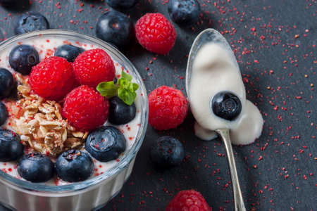 Healthy dessert. Homemade natural yogurt with fresh berries and muesli. Selective focus