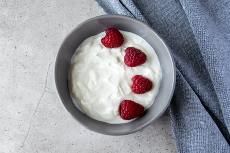 Natural fresh Greek yogurt with red raspberry berries in the gray plate and napkin for healthy breakfast. Space for text.