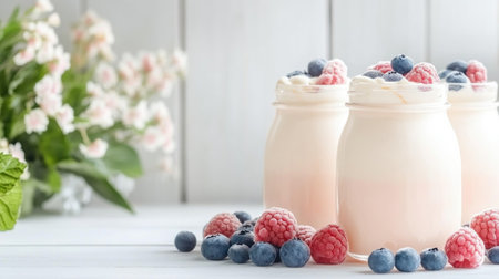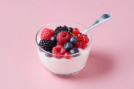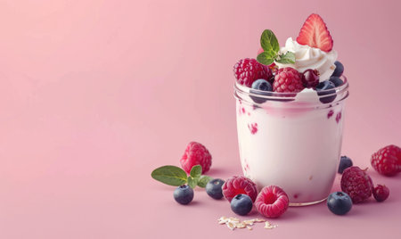 Enjoy this delightful image of creamy yogurt topped with raspberries and blueberries in jars, resting on a soft pink background, creating a fresh and vibrant dessert scene.