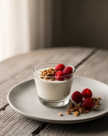 AI Generated. A glass of yogurt with raspberries and granola on a wooden table