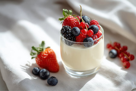 Yogurt with strawberries, raspberries and blueberries on a breakfast table.