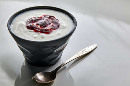 Sweet yogurt dessert with red currant jam in a dark bowl