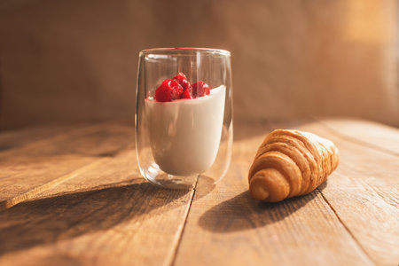 double glass with yogurt and berries and croissant on a wooden table where the bright sun is shining