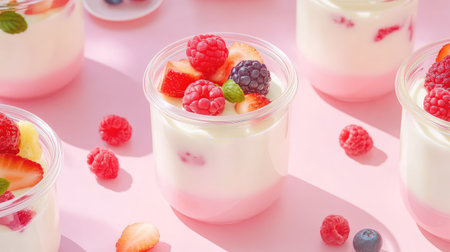 These delightful yogurt cups feature fresh raspberries and blueberries atop a creamy base, set against a soft pink background, perfect for a healthy snack or dessert.