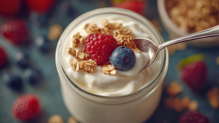 Discover a vibrant yogurt dessert featuring fresh raspberries, blueberries, and crunchy granola, all served in a glass jar for a delightful and healthy treat.