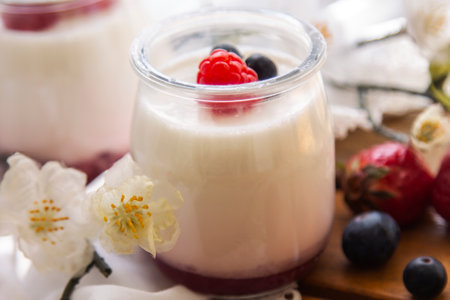 Milk yogurt with raspberries, layered yogurt with raspberry flavor and fresh berries