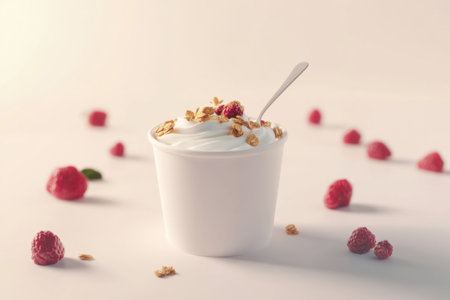 Closeup Of Yogurt With Fresh Raspberries On White Background, With Empty Space