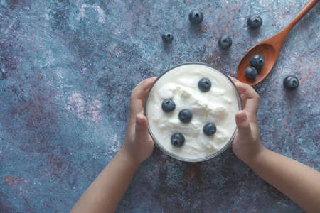 top view of child hand holding a bowl of fresh yogurt with blue berry