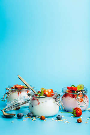 Yogurt with granola, fresh berries and nuts in a jar on a blue background. Healthy breakfast and dessert milk concept. Beautiful bright food photo