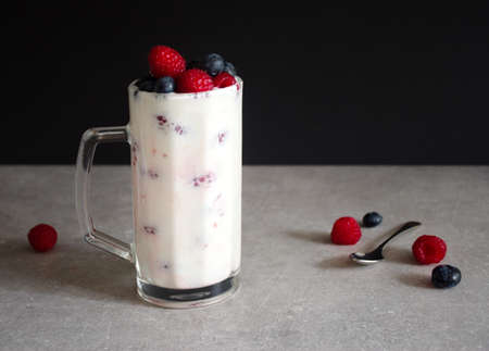 tender, delicious, diet white yogurt with raspberries and blueberries on the table