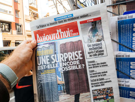 Strasbourg, France - May 25, 2019: Man hand POV reading at press kiosk Aujordhui newspaper featuring 2019 European Parliament election predictions a day before the vote