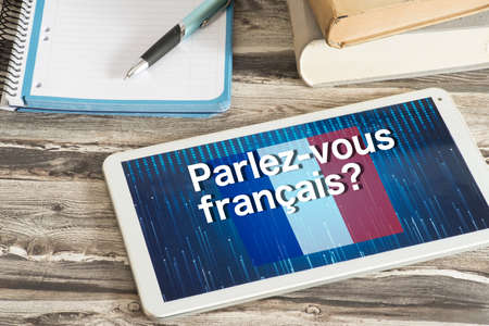 Person taking online courses on tablet to learn French language