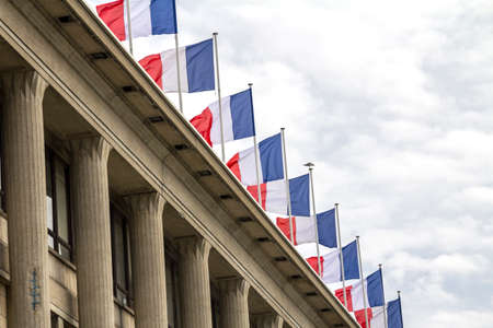 Closeup of a row of french flags waving on a roof top