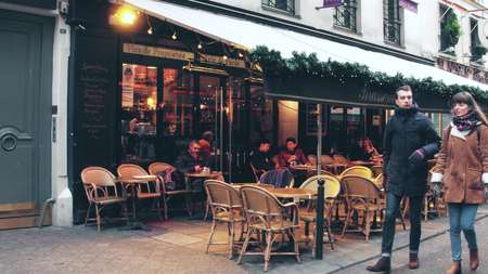 PARIS, FRANCE - DECEMBER, 31, 2016. Walk along beautiful Parisian brasserie, small restaurant, with awnings