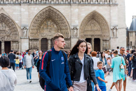 Tourist at the square in front of the Notre-Dame de Paris before the big fire, a medieval Catholic cathedral on the Ile de la Cite in the 4th arrondissement of Paris