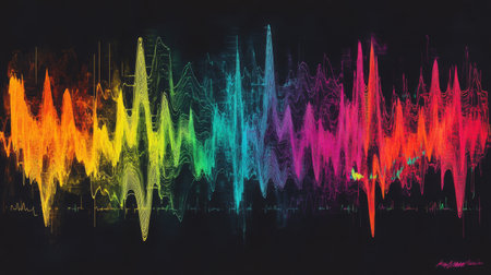 Vibrant waveforms showcase sound frequencies in colorful patterns against a dark backdrop, creating a captivating visual effect.