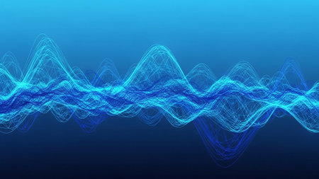 An abstract visualization features a blue waveform pattern against a gradient background. The composition uses intersecting lines, creating a volumetric effect. The image's clean aesthetic and design suggest applications in data representation, audio, and visual design. It could be used for various commercial or editorial uses.