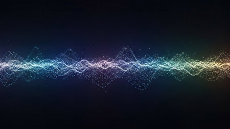 Abstract blue and purple sound wave visualization with glowing particles on a dark background.