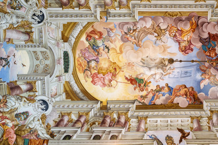 WIBLINGEN, BAVARIA, GERMANY, JUNE 08, 2022: Rococo and baroque ceilings frescoes in Wiblingen abbey, near Ulm city, by painter Januarius Zick , 18th century