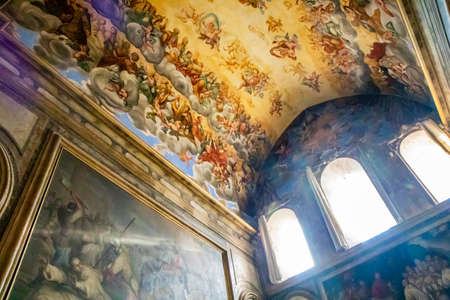 Italy, Florence - May 18 2017: the view of the ceiling frescoes fragment by Francesco Salviati in the Eleonora's Chapel at Palazzo Vecchio on May 18 2017 in Florence, Italy.