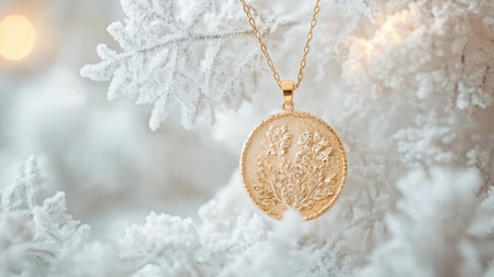 A stunning golden pendant featuring an intricate floral design hangs gracefully against a soft frosted background. This elegant piece adds a touch of winter wonder and elegance to any outfit, perfect for festive occasions.