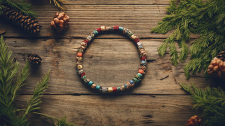 This vibrant beaded bracelet rests on a rustic wooden surface surrounded by pine cones and greenery, showcasing a nature-inspired aesthetic perfect for jewelry lovers.