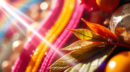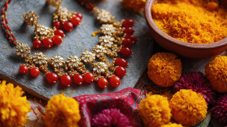 Bright colorful background with a set of flowers and a jewelry at a wedding in India. Generative AI.