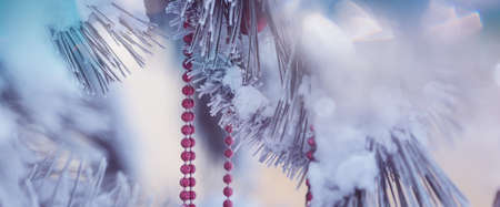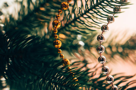 christmas garlands on a green Christmas tree, macro photography, beautiful bokeh