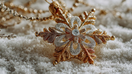 This exquisite golden snowflake pendant showcases intricate silver detailing, a perfect representation of winter elegance and seasonal charm against soft white snow.