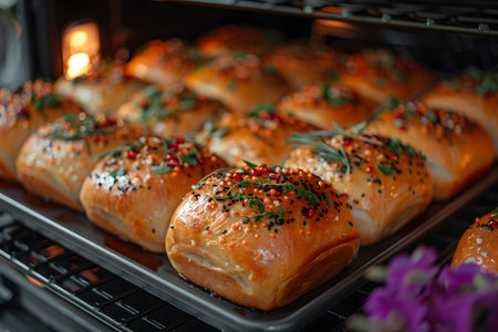 Golden-brown artisan bread rolls, beautifully garnished with an assortment of herbs and seeds, bake to perfection in a hot oven. these vibrant, freshly-made rolls highlight the art of home-baking and are ideal for culinary-themed photo collections. Generative AI