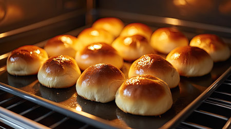 A baking sheet of freshly risen buns placed in a warm kitchen oven, with the bunsaegolden tops glowing under the oven light, ideal for any meal