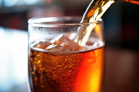 Pouring beer into a glass with foam forming, close-up shot with blurred background