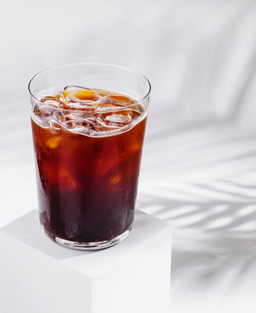 Refreshing glass of cold brew coffee standing on white cube with tropical plant shadow