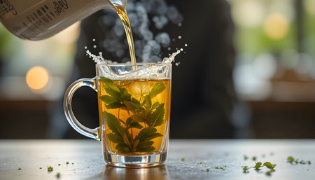A person pouring hot tea into a clear glass mug with green leaves on a table