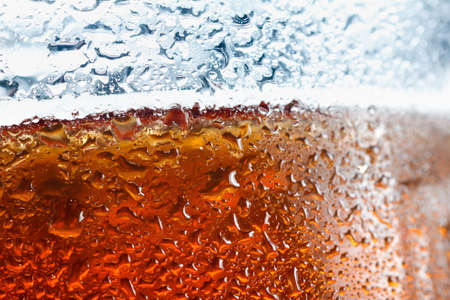 Macro bubble and foam on the glass wall of cola, focus on center