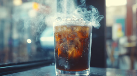 Iced coffee with steam in glass on table near window in cafe, blurred background. Refreshing beverage and cafe ambiance concept