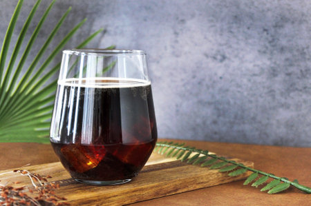 Espresso tonic with clear ice cube in tumbler glass on oak wood table with copy space