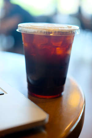 Close up ice of americano on wood table in coffee shop