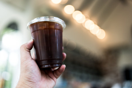 A hand holding an iced black coffee or americano is slightly blurred