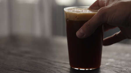 glass of dark stout beer with foam and bubbles in hand of a man in pub behind bar