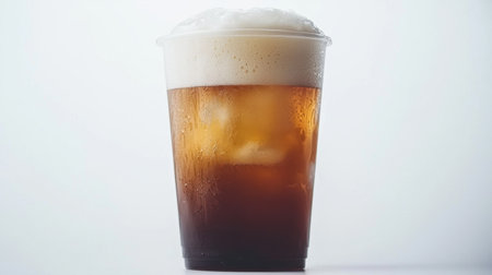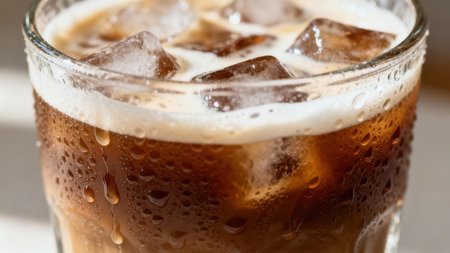 Extreme shot highlighting the textures of cold condensation on glass and layered dark iced coffee with melting transparent ice cubes and thick creamy white foam floating on top.