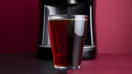Black coffee in a glass and a black coffee machine on a red background
