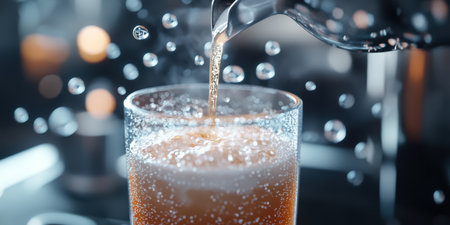 A macro close-up of fizzy drink bubbles sparkling under warm sunlight, creating a refreshing and dynamic visual.
