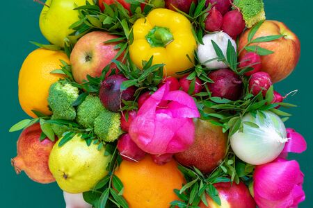 Wonderful, unconventional, multicolored floristic arrangement with fruits, vegetables, peonies and leaves on a green background. Close up, top view