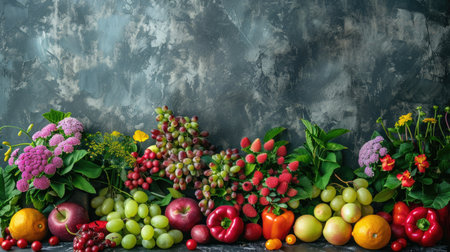 Explore a vibrant collection of fresh fruits and vegetables artfully arranged on a grey table surface. Ideal for promoting healthy eating and organic produce.