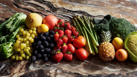 A vibrant display of fresh fruits and vegetables arranged on a polished marble surface, ideal for promoting healthy eating and nutrition.