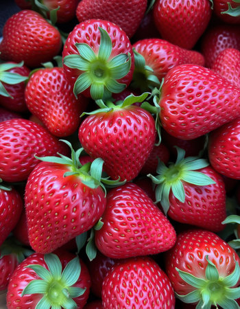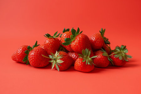 Heap of ripe, juicy strawberries with vibrant green stems against a striking red backdrop