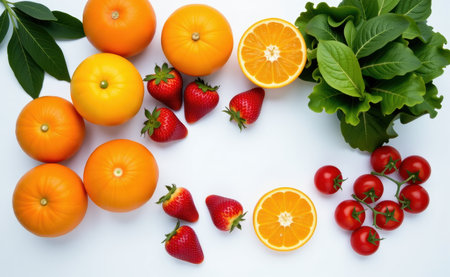 Fresh fruits and vegetables arranged on a clean white background, showcasing healthy food choices and vibrant colors.