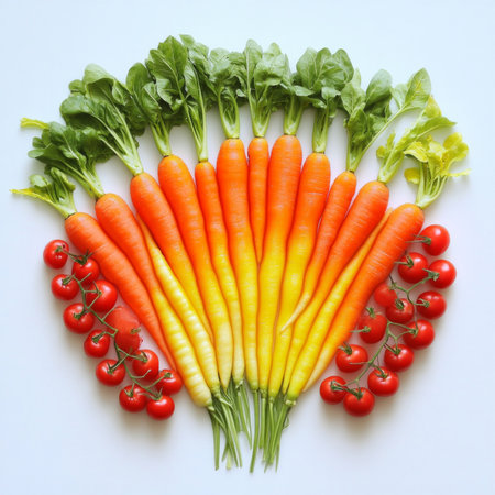 Fresh colorful carrots and cherry tomatoes in a vibrant rainbow arrangement.